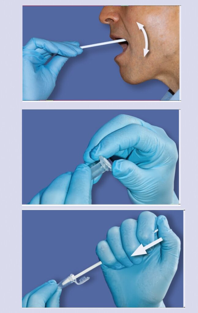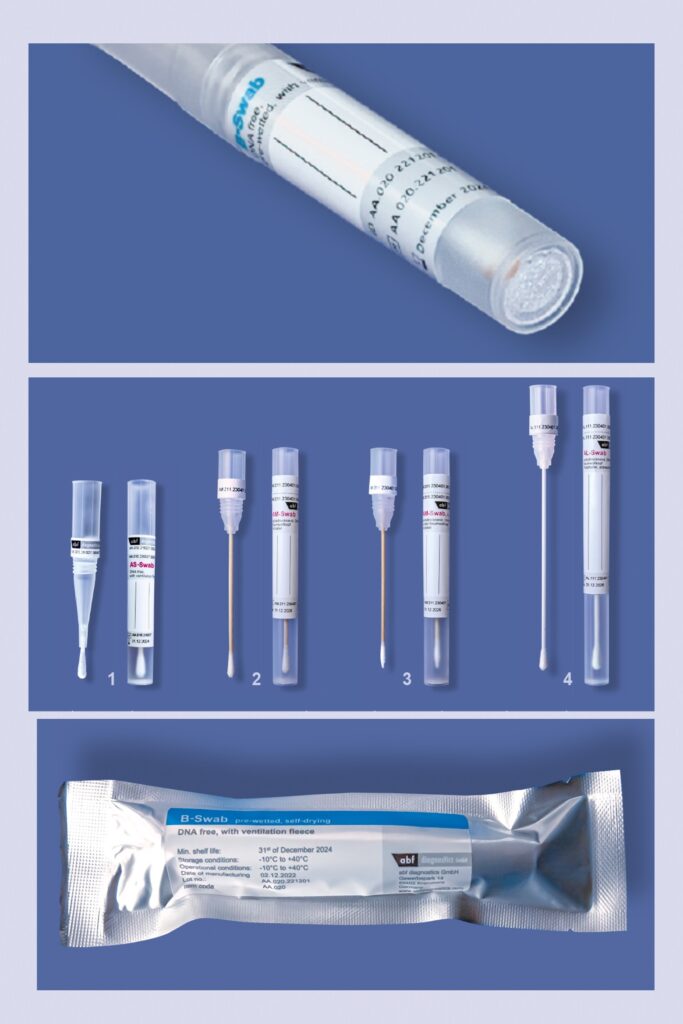 This system can be used for various types of swabs. The illustration on the right shows the collection of a cheek swab (comparison samples) using abf E1-Swabs. However, trace samples can also be stored and transported in this way using standard swabs.