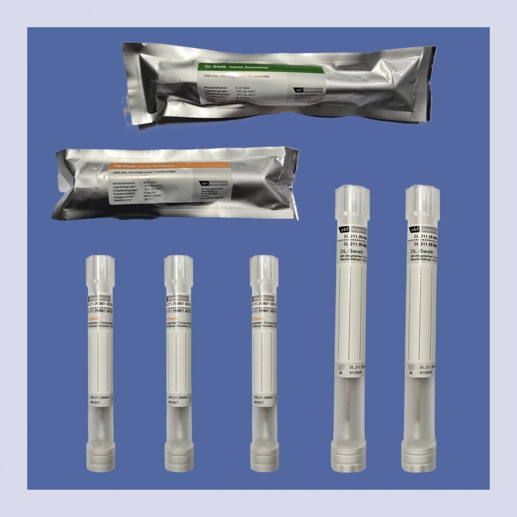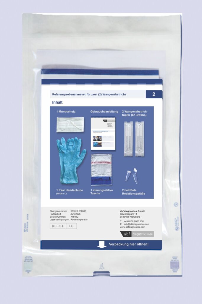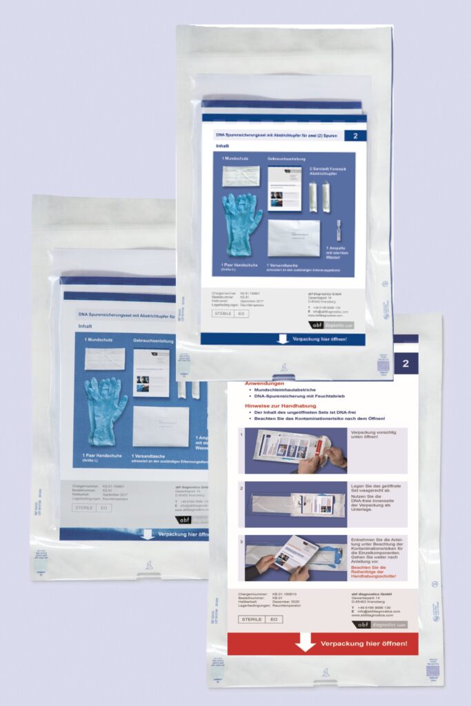 The composition and labeling of the sets are generally based on your requirements. As standard, we pack cotton swabs (alternatively adhesive stamps), gloves, face masks, shipping bags, water ampoules (for moistening the cotton swabs), and instructions appropriate to the set. Different packaging options are available depending on the intended use.