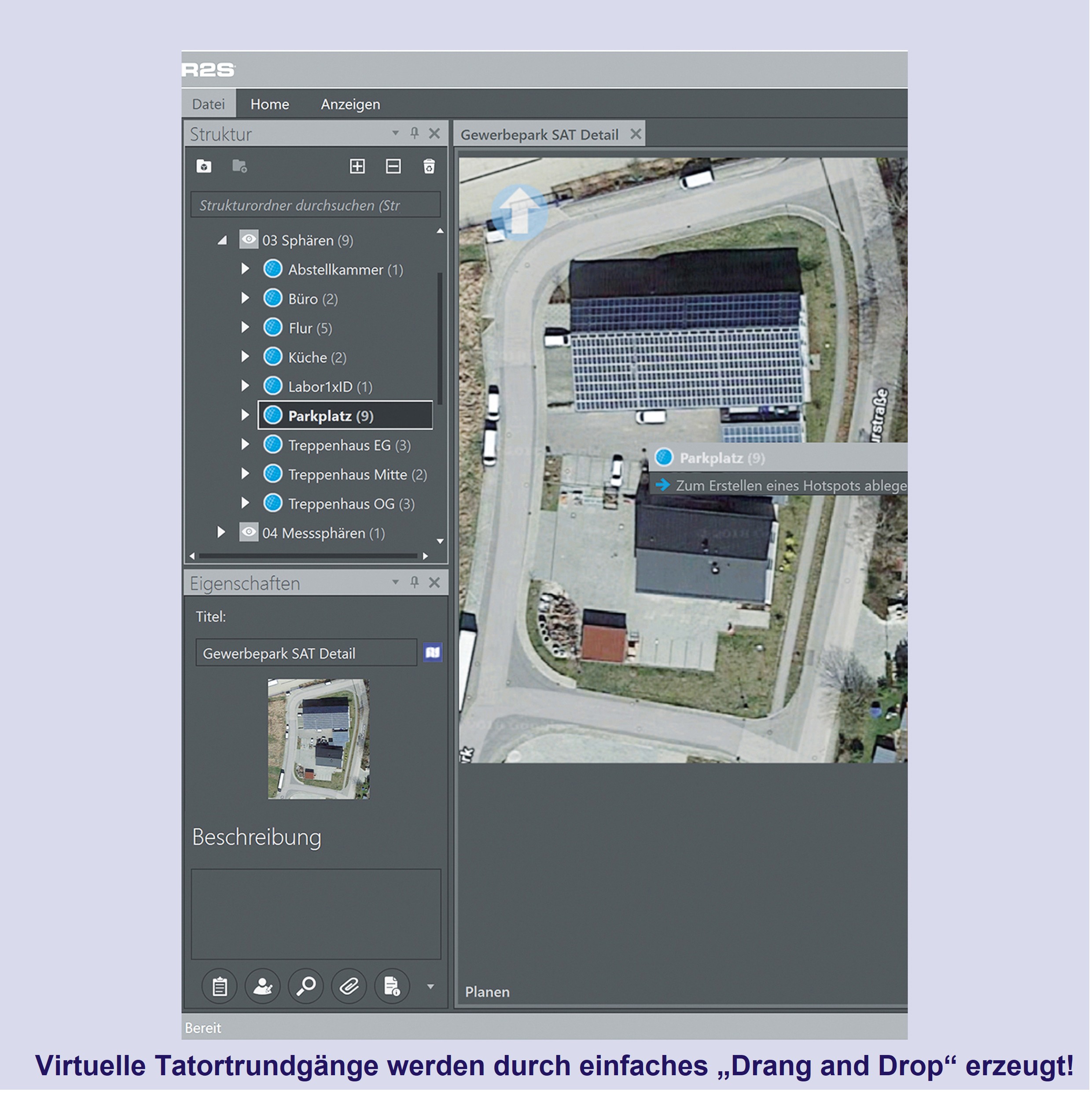 - Verwendung hochaufgelöster, sphärischer (360 °) Aufnahmen als jpg, hdr, tiff oder bmp